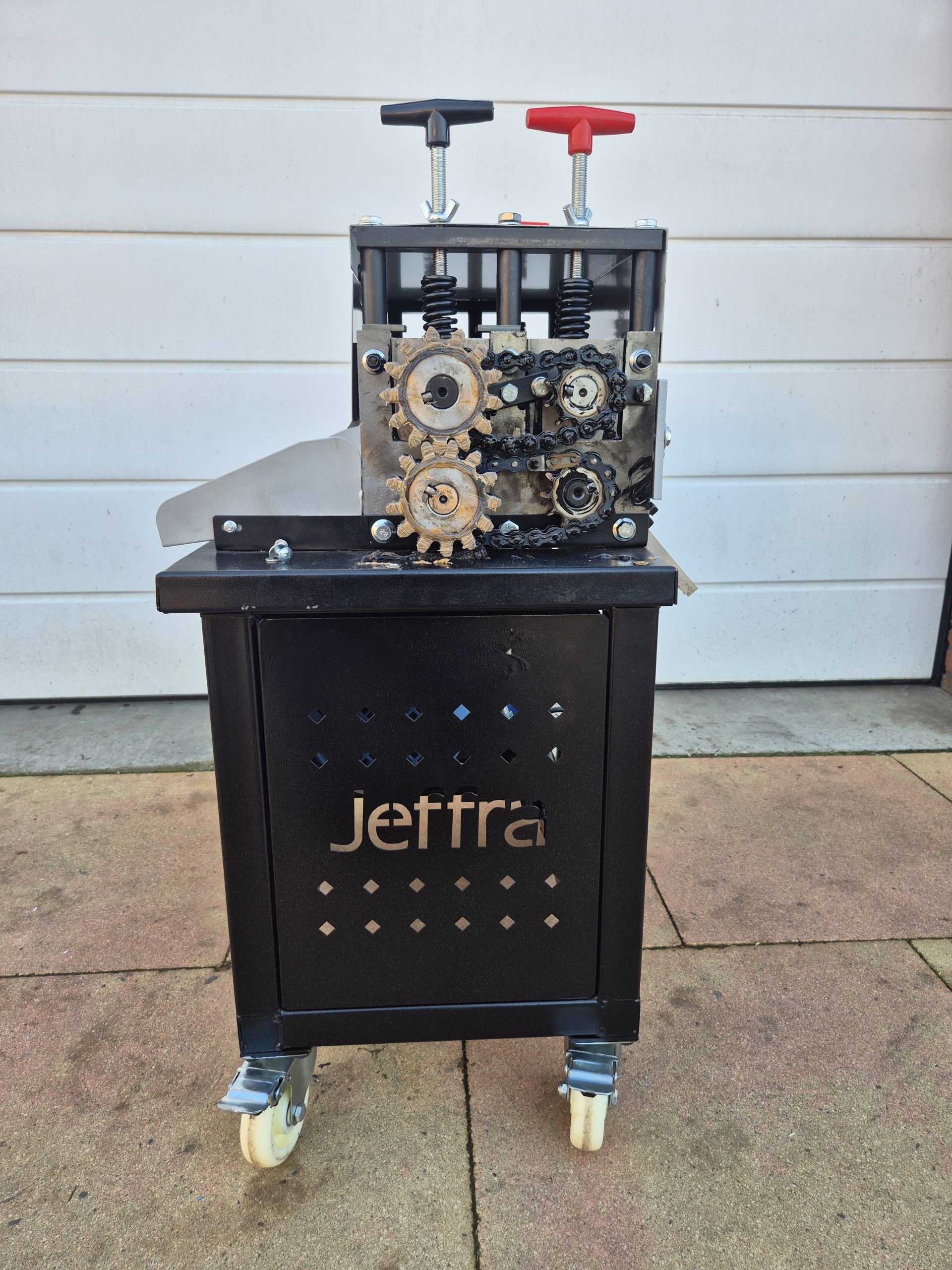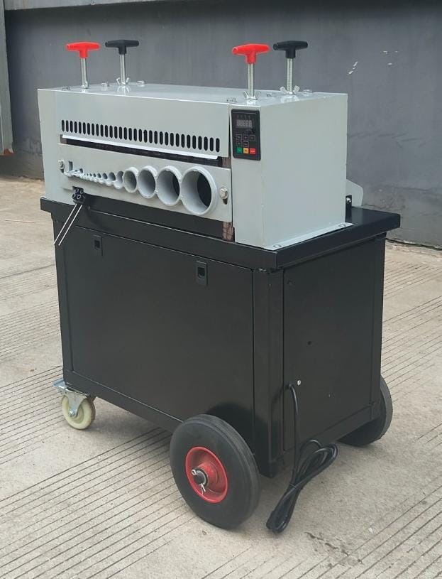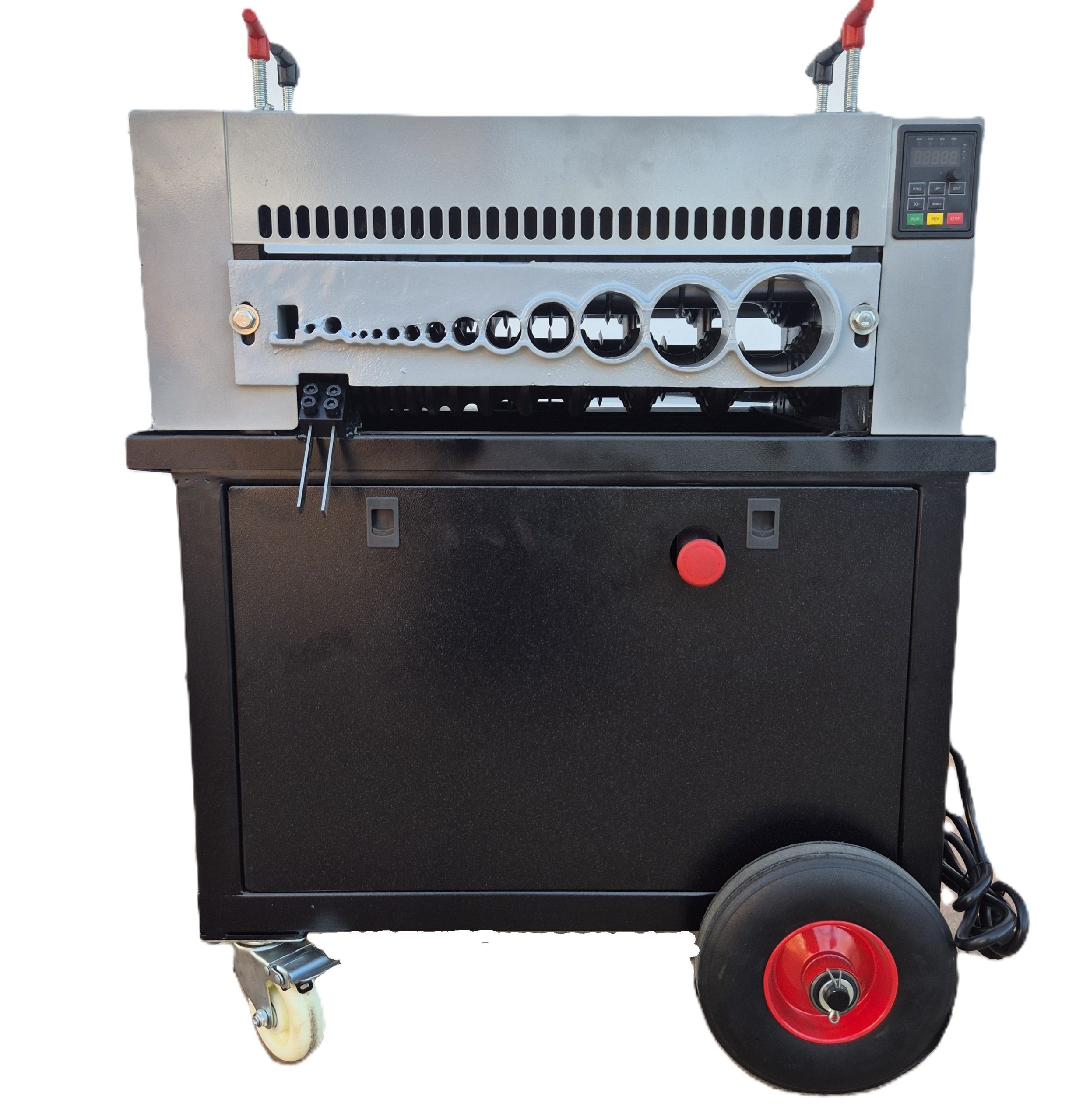 Een belangrijk kenmerk van deze kabelstripmachine is het dubbelzijdig snijmechanisme, dat zorgt voor een snelle en efficiënte verwerking. Daarnaast zijn de rollen voorzien van gegroefde schuine vlakken, waardoor de kabel optimaal wordt vastgepakt en soepel door de machine wordt geleid.