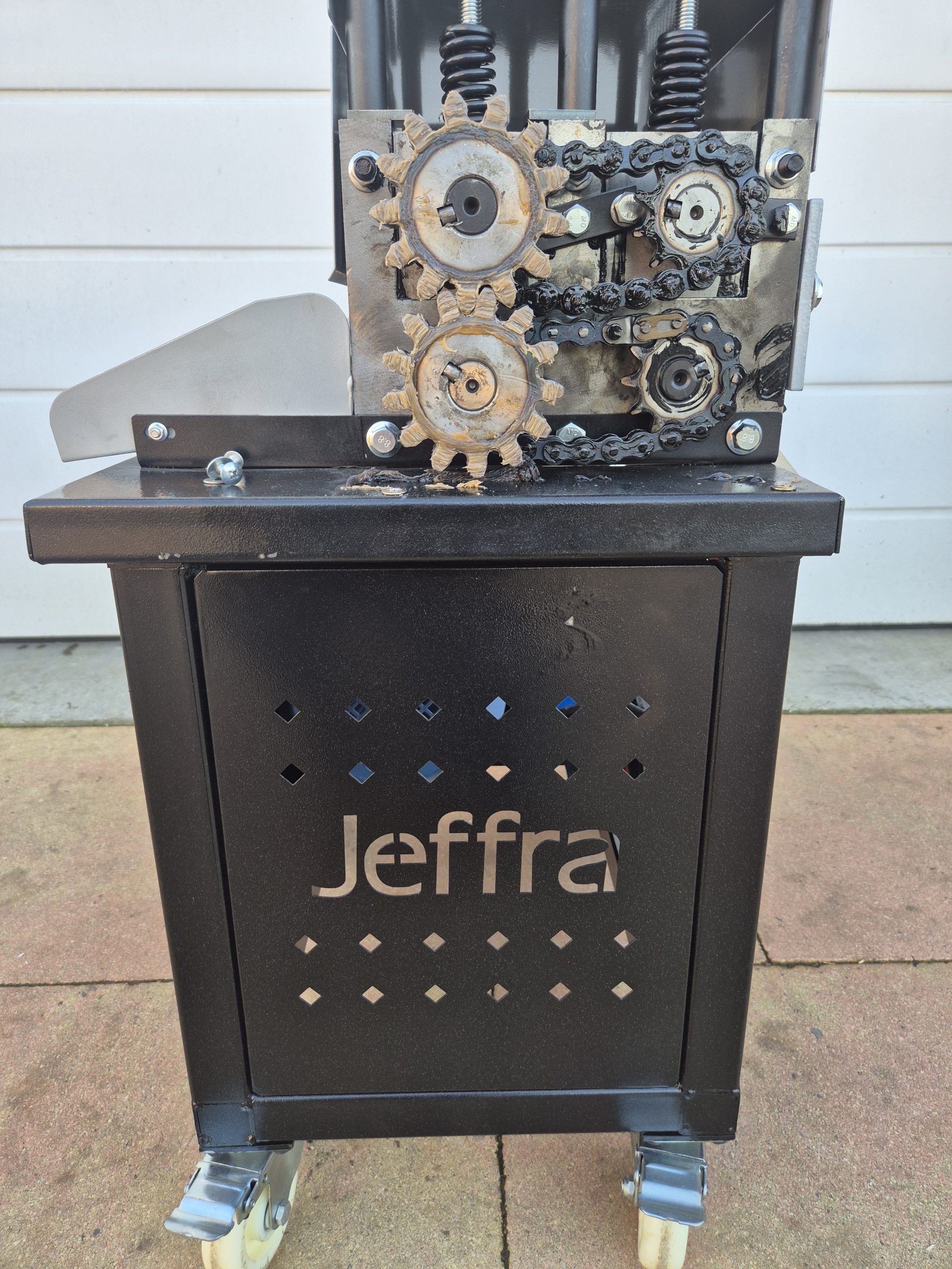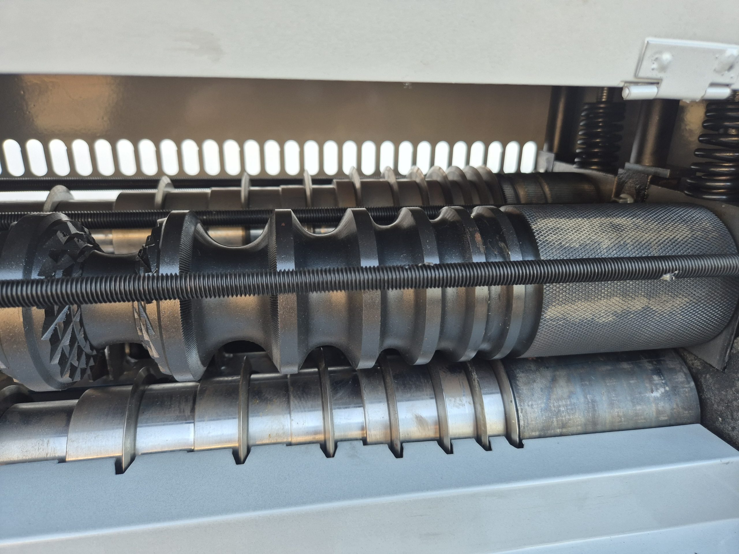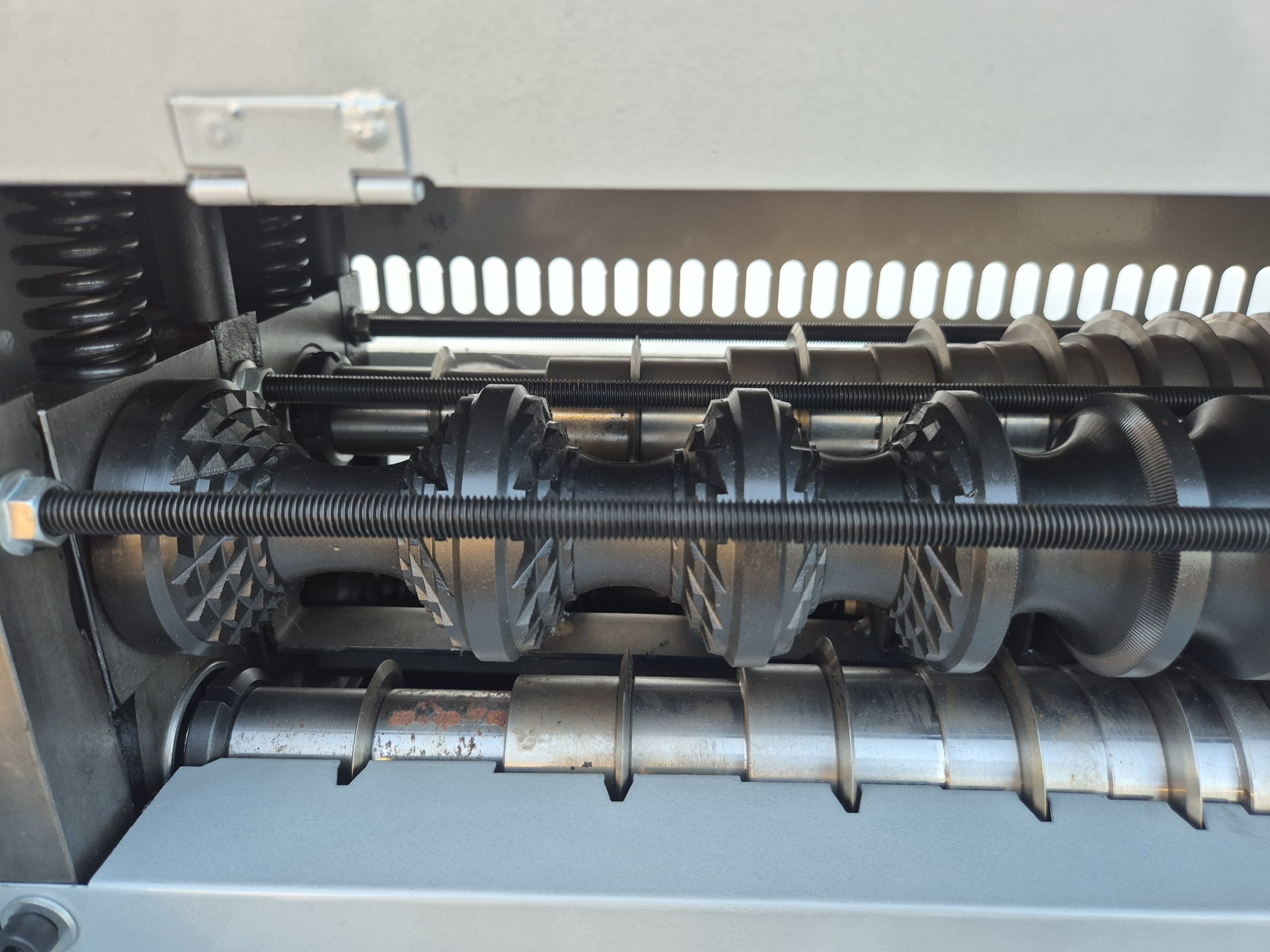 Een belangrijk kenmerk van deze kabelstripmachine is het dubbelzijdig snijmechanisme, dat zorgt voor een snelle en efficiënte verwerking. Daarnaast zijn de rollen voorzien van gegroefde schuine vlakken, waardoor de kabel optimaal wordt vastgepakt en soepel door de machine wordt geleid.